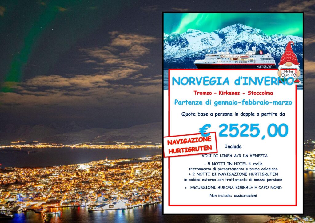 Preparatevi ad un inverno spettacolare! A partire da gennaio, il grande Nord vi aspetta in tutta la sua maestosità per tante magnifiche avventure, iniziando da questo magico tour tra Norvegia e Svezia, dove la cultura urbana scandinava incontra la natura più selvaggia. Tromso, Kirkenes ed infine Stoccolma, ma in questo viaggio, a rubare la scena, sono sicuramente le due notti a bordo del leggendario Hurtigruten tra paesaggi onirici e fiordi imponenti, sognando lo spettacolo dell’aurora boreale!